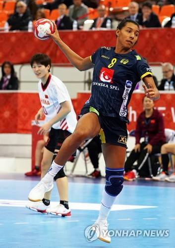 epa08039598 Jamina Roberts of Sweden in action during the IHF Women's World Championship handball match between China and Sweden in Kumamoto, Japan, 02 December 2019. EPA/HIROSHI YAMAMURA