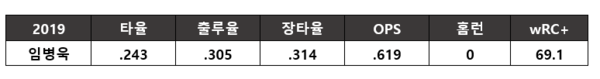 작년의 활약은 신기루였을까? 입대까지 미루고 야심차게 맞이한 임병욱의 2019시즌은 씁쓸하기만 했다. 시즌 중반까지 압도적인 삼진 페이스를 보이며 역대 최초 ‘무홈런 삼진왕’이라는 타이틀에 가까워지기도 했다. 결국 무릎 부상으로 포스트시즌 엔트리에도 들지 못한 임병욱은 아쉽게 시즌을 마무리했다.