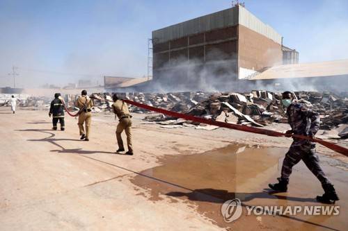 epa08041545 Firefighters work at the scene of fire at a tile manufacturing unit in an industrial zone, north Khartoum, Sudan, 03 December 2019. According to media reports quoting medical sources, at least 15 people were killed and more than 90 injured in an explosion at tile factory in Khartoum. The cause of explosion was not immediately clear. EPA/MARWAN ALI