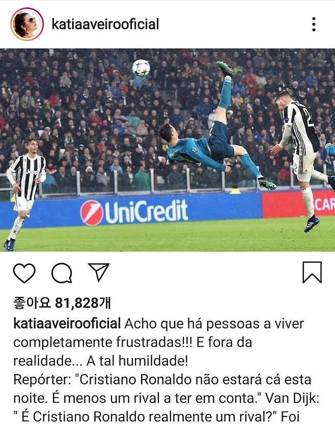 아베이로의 레알 마드리드 시절 유벤투스를 상대로 넣었던 오버헤드킥 사진을 걸어놓고 판 다이크 저격을 시작했다. “호날두는 당신이 수년 간 뛰어 온 무대에서 3관왕에 성공했지만 당신은 아직 트로피를 손에 넣지 못했다”고 적었다.