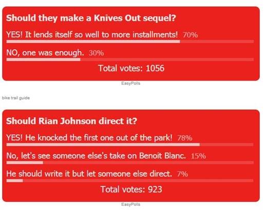 ‘나이브스 아웃’은 예상을 훌쩍 뛰어넘어 개봉 첫 주말 북미 흥행 4,100만 달러를 비롯 월드 와이드 흥행 7,000만 달러의 박스오피스 수익을 올렸다. 당연히 속편 기대감이 높아졌다. 5일 현재 미국 영화매체 커밍순 설문 결과, 70% 이상이 라이언 존슨 감독이 직접 각본을 쓰고 연출을 맡는 속편을 원하고 있다. 라이언 존슨이 새로운 ‘스타워즈 3부작’ 감독을 맡게될지 여부에 따라 속편 제작이 결정될 것으로 보인다.