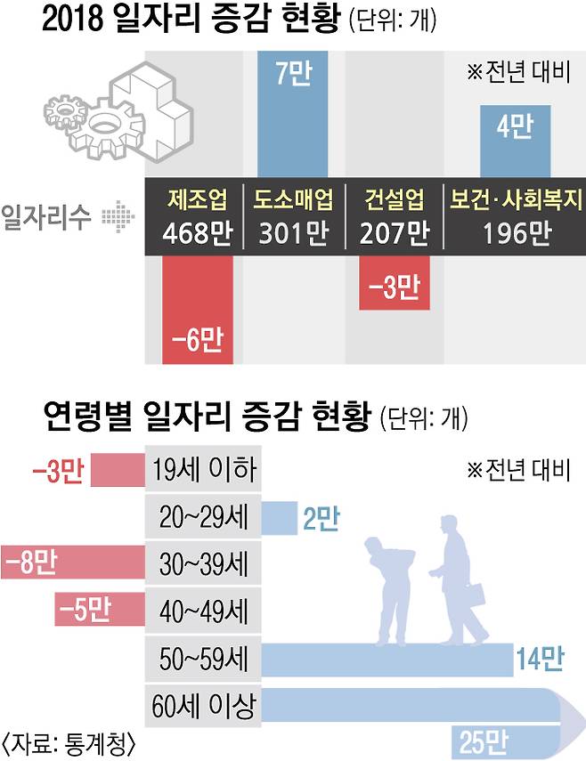 5일 통계청이 발표한 ‘2018년 일자리행정통계 결과’에 따르면 지난해 일자리는 2342만개로 1년 전보다 26만개 늘었다. 하지만 조선과 자동차, 기계 등을 중심으로 고강도 구조조정이 이뤄지면서 지난해 제조업 일자리는 6만개나 줄었다.