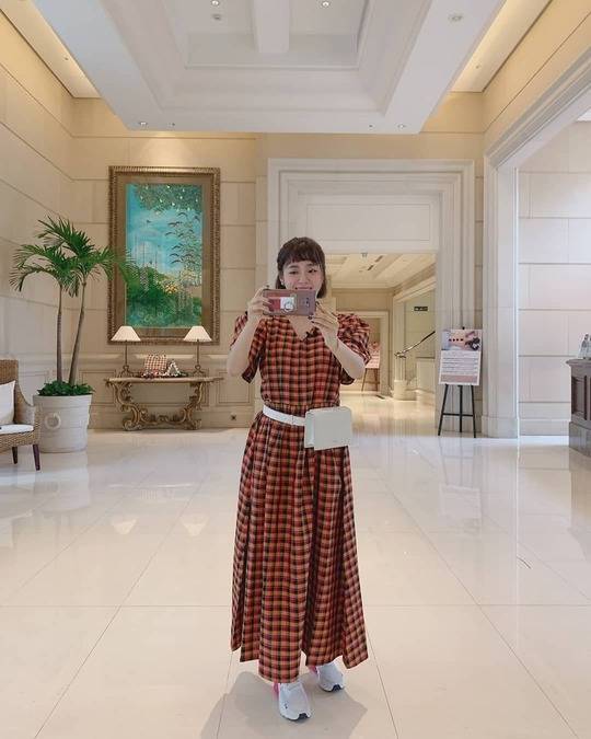 사진 속 이영은은 체크 원피스를 입고 거울 셀카를 찍고 있다.