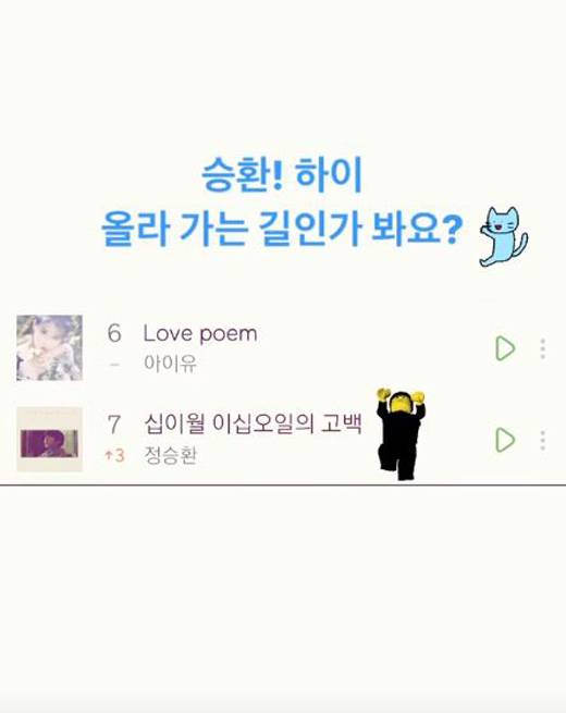 또 스토리에는 자신의 곡 '러브 포엠(Love poem)'과 정승환의 '십이월 이십오일의 고백'이 나란히 음원 차트 6, 7위에 올라와 있는 것을 캡처해 "승환! 하이 올라가는 길인가봐요?"라는 글을 함께 남기며 훈훈한 친분을 자랑했다.