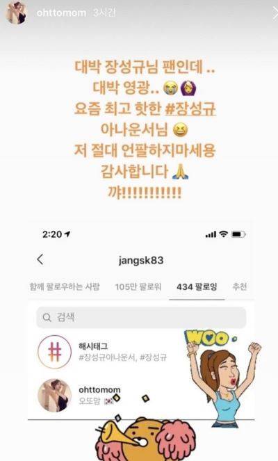 오씨는 지난 5일 자신의 인스타그램 스토리에서 장성규 인스타그램 팔로우 소식을 알리며 오또맘은 "장성규님 팬인데 대박 영광. 핫한 장성규 아나운서님 저 절대 언팔(구독 취소)하지 마세요. 감사합니다"라는 글을 남기며 자신을 팔로우한 장성규의 계정을 공개했다.