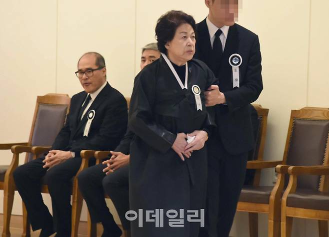[이데일리 방인권 기자] 故 김우중 전 대우그룹회장의 부인 정희자 여사(오른쪽 두번째)가 10일 경기 수원시 아주대병원 장례식장에서 가족의 부축을 받은 채 걸어가고 있다. 왼쪽은 고 김우중 회장의 장남 선협씨.
