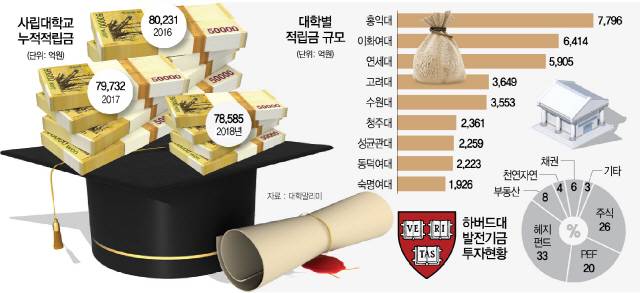 외국의 경우 대학들이 적극적인 자산운용을 통해 장학금·연구비 등의 지원을 늘려왔다. 대표적인 경우가 하버드대로 하버드대기금은 별도의 투자회사 HMC를 통해 주식·헤지펀드 등에 투자하면서 2018년에는 10%, 2019년에는 6.5% 등 설립이래 연 11%의 수익률을 기록해왔다.