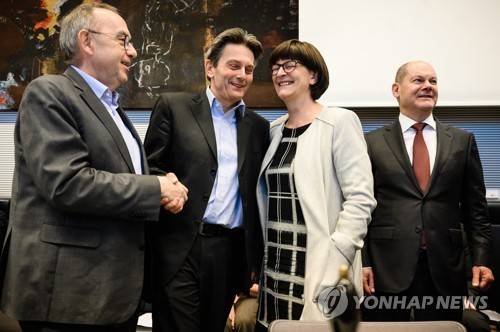 epa08059939 Social Democratic Party (SPD) co-chairs Saskia Esken (3-L) and Norbert Walter-Borjans (L) and Social Democratic Party (SPD) Bundestag faction chairman Rolf Muetzenich (2-L) talk next to German Minister of Finance Olaf Scholz (R) during the beginning of a Social Democratic Party (SPD) faction meeting in Berlin, Germany, 10 December 2019. The SPD parliamentary group assembles on a regular basis prior to sessions of the German parliament Bundestag. The new Social Democratic Party (SPD) co-chairs Saskia Esken and Norbert Walter-Borjans attended the meeting for the first time after their election during the party convention. EPA/CLEMENS BILAN