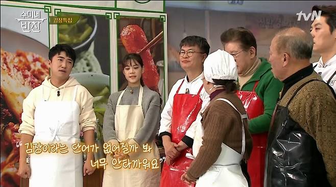 이번 ‘김장 축제’ 특집에는 일정이 있는 미카엘 셰프를 대신해 송훈 셰프와 여경례 셰프가 출연했다. 김장 축제장에 도착한 출연자들은 사방을 둘러싼 대형 플래카드에 깜짝 놀랐고 특히 ‘허리 펴면 죽는다’는 문구를 보던 임현식은 “차라리 허리펴고 죽자”라고 말해 웃음을 안겼다.
