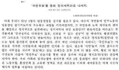 1980년대를 지배해온 것은 혁명만이 독재정권을 무너뜨릴 수 있다는 생각이었다. 그런데 1987년 6월항쟁으로 군사독재의 시대는 막을 내렸다. 헌법 개정으로 권력을 국민의 손으로 창출하게 되었다. 선거를 통한 권력 창출이 보장된 이상 혁명으로 세상을 바꾸자는 주장은 설 자리를 잃어갔다. 여기에 소련 등 국가사회주의 진영이 붕괴하면서 이른바 사회주의 혁명론도 설득력과 함께 하기 힘든 것처럼 현실의 근거를 상실하였다. 활동노선과 전략의 근본적 재검토가 시급했다. 신노선은 불가피했다(노회찬.구영식, <대한민국 진보, 어디로 가는가?>, 비아북, 2014, 102쪽).