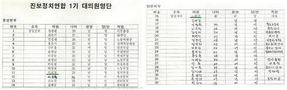 "동지는 간 데 없고 깃발만 나부끼던" 그 시절, 노회찬이 공동대표를 맡고 있던 <진보정치연합> 1996년 1기 대의원 명단에 중앙본부와 양천지부의 당연직 대의원으로 두 사람의 이름이 보인다.