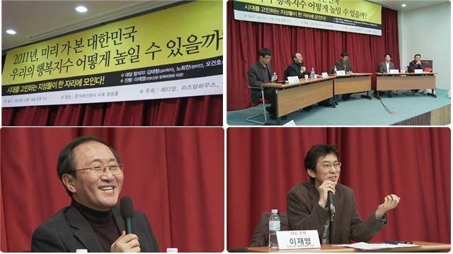 2010년 12월 14일 「2011년, 미리 가 본 대한민국: 우리의 행복지수 어떻게 높일 수 있을까」가 개최된다. <불안증폭사회>의 저자 김태형과 노회찬, 오건호, 우석훈이 패널로 참석하고 이재영이 대담 진행을 맡는다. "과연 지금의 한국 사회는 행복한가? 라는 질문과 더불어, 그렇지 않다면 어떻게 하면 행복해질 수 있을지?"라는 이재영의 물음에 대해 노회찬은 이렇게 답한다.