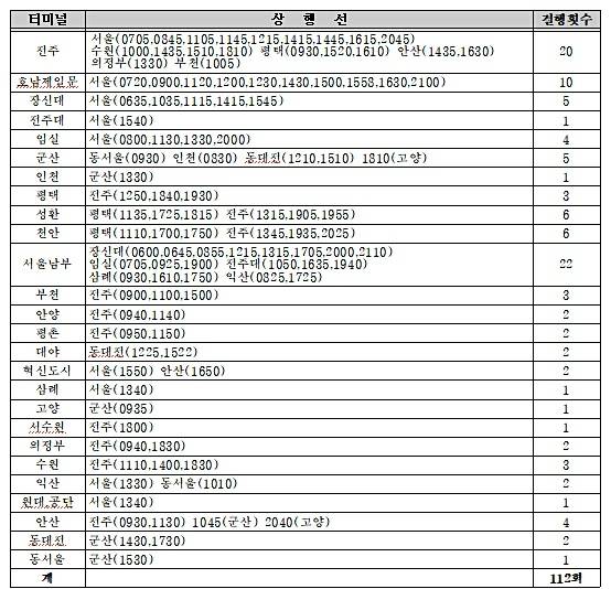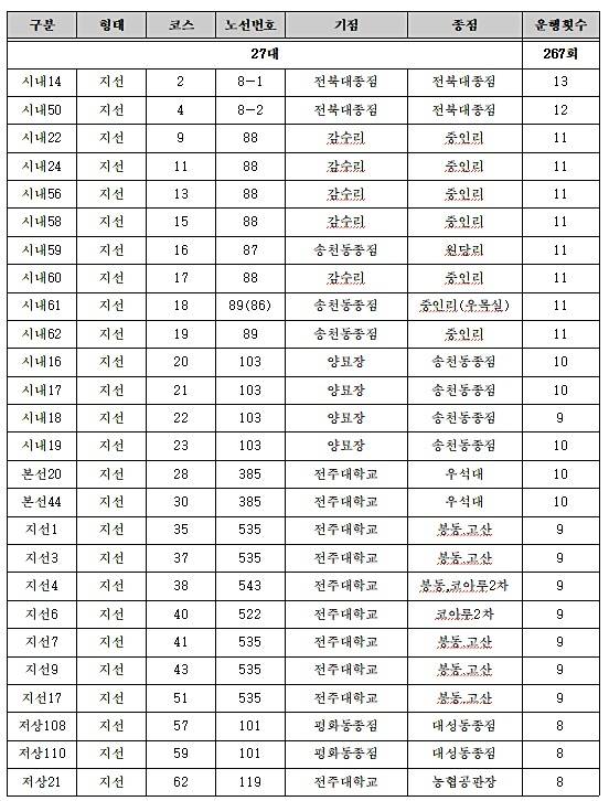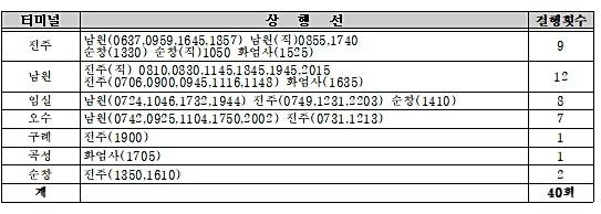[표] 호남고속 시내·외버스 결행노선 및 횟수