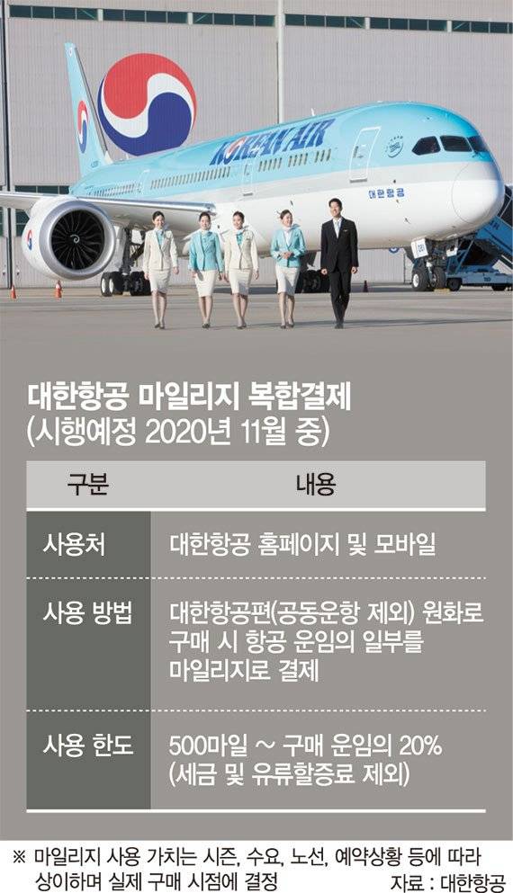 대한항공 관계자는 "해외 항공사는 특정 등급 이상의 회원에게만 복합결제 자격을 부여하거나 최소 마일리지 사용 단위가 크다"며 "대한항공의 경우 모든 항공권에 마일리지를 사용할 수 있고, 복합결제에 사용된 마일리지 양에 관계없이 예약 등급에 따라 마일리지도 적립된다"고 말했다.