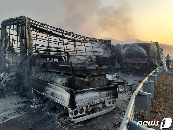 (군위=뉴스1) 공정식 기자 = 14일 오전 경북 군위군 상주영천고속도로에서 도로 결빙으로 인한 2건의 다중추돌 사고와 차량 화재가 발생해 차량이 뼈대만 남아 있다. 사고로 40여대의 차량이 뒤엉키며 상주-영천고속도로 양방향이 마비된 상태다.