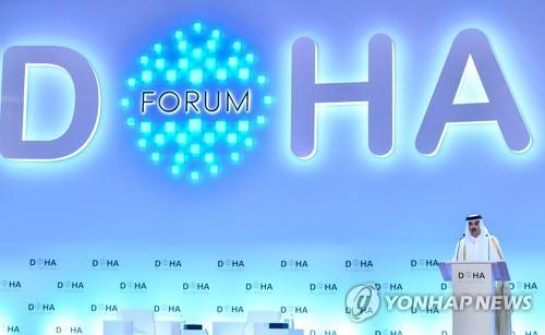 epa08070850 Emir of Qatar Sheikh Tamim bin Hamad Al-Thani, delivers a speech during the opening session of the Doha Forum at Sheraton Grand Doha Resort & Convention Hotel in Doha, Qatar, 14 December 2019. The Doha Forum, a global platform for dialogue gathering world leader and policy makers among others to build innovative and action driven networks, runs on 14 and 15 December. EPA/Noushad Thekkayil