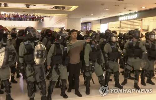 In this image made from video, a protester is arrested by police at a shopping mall in Sha Tin district in Hong Kong, with shoppers watch from balconies above, Sunday, Dec. 15, 2019. The rally, which had a Christmas shopping theme, was the latest in a series of demonstrations, which have beset Hong Kong for more than six months.(AP Photo)