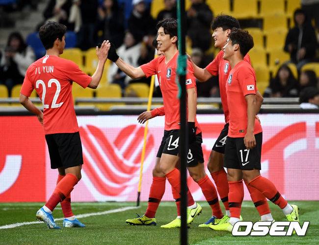 전반 한국 김민재가 헤더로 선제골을 작렬시키고 동료들과 기뻐하고 있다. /dreamer@osen.co.kr
