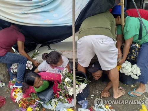 Trapped flower vendors are pulled out from a collapsed wall following a strong earthquake that struck Padada, Davao del Sur province, southern Philippines on Sunday Dec. 15, 2019. A strong quake jolted the southern Philippines on Sunday, causing a three-story building to collapse and prompting people to rush out of shopping malls, houses and other buildings in panic, officials said. (AP Photo/John Angelo Jomao-as)