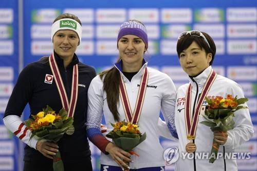 From left, silver medalist Austria's Vanessa Herzog, gold medalist Russia's Angelina Golikova and bronze medalist Japan's Nao Kodaira pose together during a medal ceremony for the ladies 500 meters race of the speed skating World Cup at the M-Wave in Nagano, Japan, Sunday, Dec. 15, 2019. (AP Photo/Toru Hanai)