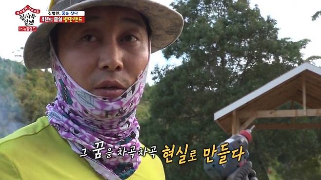김병만은 "이런거 짓는 걸 좋아해서 목조주택도 세 채 지어봤다. 시간이 오래 걸린다. 이만큼 하는 데 4년 걸렸다"며 "병만랜드를 상상했다. 게임 캐릭터가 돼서 직접 다 혼자 만든 거다. 시골에서 자라서 그런지 흙냄새가 좋고 혼자 뭘 만드는 걸 좋아하게 되더라. 이러다보니까 여기까지 오게 됐다. 자연을 크게 훼손하지 않고 지키면서 내가 머릿속에 상상한 것들이 그려졌다. 캠핑 그라운드 같은 공간을 만들고 싶었다"고 밝혔다. (사진=SBS '집사부일체' 캡처)