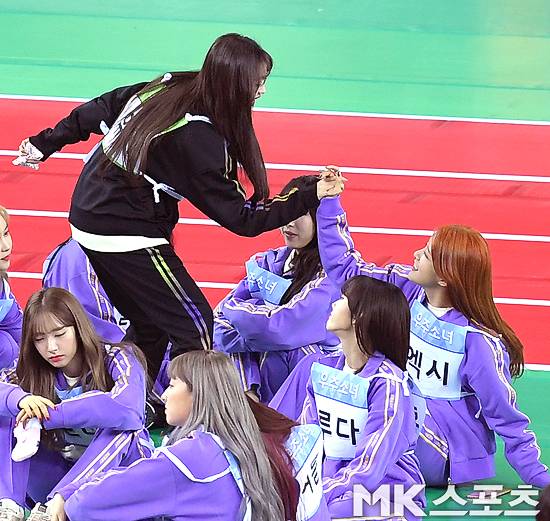 걸그룹 오마이걸 멤버 유아와 우주소녀 엑시가 16일 인천 남동체육관에서 열린 ‘2020 설특집 아이돌스타 선수권대회’ 시작 전 인사를 나누고 있다.