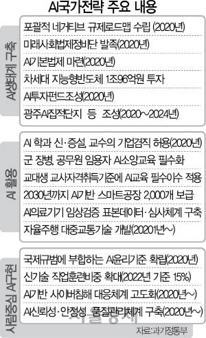과학기술정보통신부 등 정부부처들이 17일 열린 국무회의에서 ‘AI국가전략’을 발표한 것은 이 같은 토종 AI생태계의 한계를 극복하기 위해서다. 지난 10월 28일 문재인 대통령이 발표한 ‘AI 기본구상’을 바탕으로 경제·사회 전반에 AI혁신을 일으키기 위한 정책추진 내용 등을 담았다. 이번 전략은 AI생태계조성, AI활용, 사람중심 AI실현이라는 3가지 범주로 구성됐다. 이중 생태계조성을 위해 내년부터 과감한 규제 혁신과 법제도 정비가 추진된다는 내용이 가장 주목되는 부분이다. AI분야에 대해 ‘선(先)허용-후(後)규제’를 기본 방향으로 하는 포괄적 네거티브 규제 로드맵을 내년에 마련하겠다는 것이다. AI시대에 대비한 기본법제와 경제협력개발기구(OECD) 등의 국제규법에 부합하는 AI윤리기준도 내년에 수립하기로 했다. 아울러 미래사회법제정비단 발족도 내년에 발족한다.