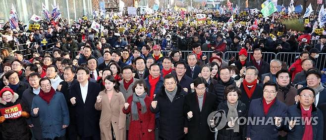 (서울=연합뉴스) 신준희 기자 = 자유한국당 황교안 대표와 의원들이 18일 여의도 국회 정문 인근에서 열린 '공수처법·선거법 날치기 저지 규탄대회'에서 지지자들과 함께 구호를 외치고 있다. 2019.12.18