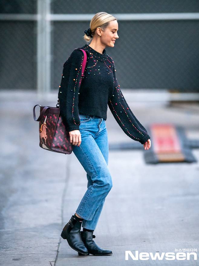 이날 브리 라슨은 화려한 차림새 대신 청바지를 입은 편안한 모습으로 이목을 사로잡았다.