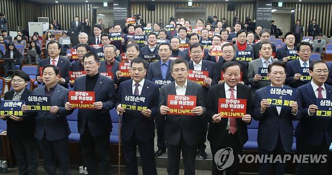 (서울=연합뉴스) 안정원 기자 = 자유한국당 황교안 대표와 심재철 원내대표 등이 19일 오후 서울 여의도 국회에서 열린 의원총회에서 손팻말을 든 채 구호를 외치고 있다. 2019.12.19