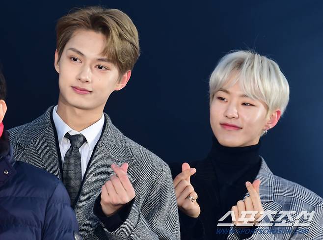 보이그룹 세븐틴의 준과 호시가 19일 코엑스 동측광장에서 열린 '코엑스 윈터 페스티벌 2019' 개막식에서 홍보대사로 위촉된 후 포즈를 취하고 있다.
