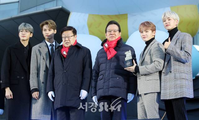 [서울경제] 세븐틴 원우, 준, 김영주 한국무역협회장, 정순균 강남구청장, 세븐틴 우지, 호시(왼쪽부터)가 19일 오후 서울 강남구 삼성동 코엑스 야외광장에서 열린 ‘코엑스 윈터페스티벌 2019’ 개막식에서 위시돌 위촉식을 마친 뒤 포즈를 취하고 있다.