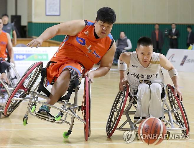 (서울=연합뉴스) 20일 오후 춘천 호반체육관에서 열린 '2019 KWBL 휠체어농구리그' 챔피언결정전 1차전 제주특별자치도와 서울특별시청 경기에서 서울 오동석과 제주 김동현이 볼을 쫓아가고 있다. 2019.12.20