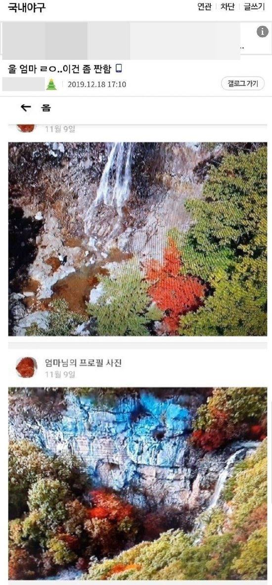 한 네티즌은 지난 18일 디시인사이드 야구갤러리(야갤)에 ‘울 엄마 ㄹㅇ..이건 좀 짠함’이라며 짧은 글을 올렸습니다. 울긋불긋한 단풍 옆으로 폭포가 흐르는 어느 고요한 숲속의 사진을 배경으로 한 엄마의 카카오톡 프로필 사진과 함께요. 화질이 흐릿한 이 사진은 엄마가 산에 가서 직접 촬영한 것이 아니라 TV 화면을 찍은 것이라고 했습니다. 그는 “집에 놀러 갈 돈이 없어서 가끔 티비에 예쁜 풍경 나오면 티비 모니터 사진 찍어서 카톡 프사로 해둔다”고 엄마의 상황을 설명했습니다.