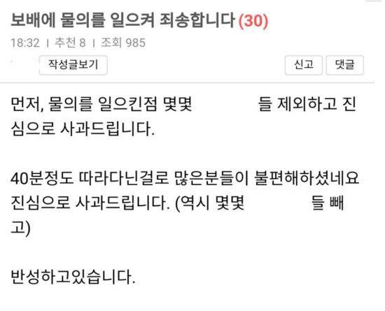 결국 이 게시글은 같은 날 다수 네티즌 신고를 받고 열람 불가 상태인 ‘블라인드’ 처리됐다. 이에 작성자는 오후 6시32분 “보배에 물의를 일으켜 죄송합니다”라는 사과글을 게시했다.