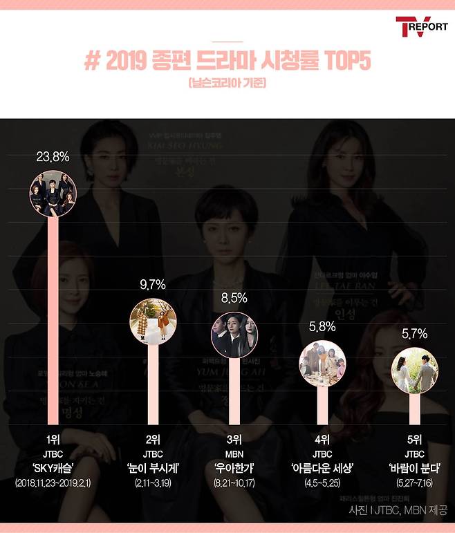 종합편성채널(이하 종편)도 이례적인 시청률로 이목을 집중시켰다. JTBC ‘SKY 캐슬’은 시청률 23.8%로 종편 역사상 전무후무한 기록을 세웠다. 이외에 ‘눈이 부시게’(9.7%)도 호평 속에 종영했다. 또한 MBN ‘우아한 가’는 방송 내내 화제를 모았으며, 시청률 8.5%로 유종의 미를 거뒀다. MBN의 드라마 흥행 가능성까지 이끌어냈다.