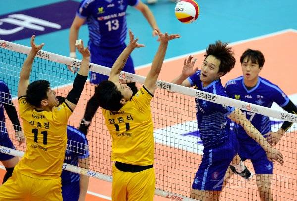 29일 경기도 의정부체육관에서 ‘2019-2020 도드람 V리그’ 의정부 KB손해보험과 인천 대한항공의 경기가 열렸다. 대한항공 손현종이 KB손해보험 블로커를 피해 공격을 펼치고 있다.