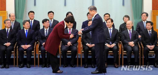 [서울=뉴시스]배훈식 기자 = 문재인 대통령이 2일 청와대 본관에서 추미애 신임 법무부 장관에게 임명장을 수여하고 있다. 2020.01.02.