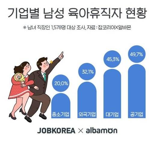사내에 육아휴직을 쓴 남성 직원이 있다고 응답한 직장인은 26.2%에 그쳤다. 이들 중 공기업 직장인이 49.7%로 가장 많았고, 대기업(45.3%), 외국계 기업(32.1%), 중소기업(20.0%)이 뒤를 이었다.