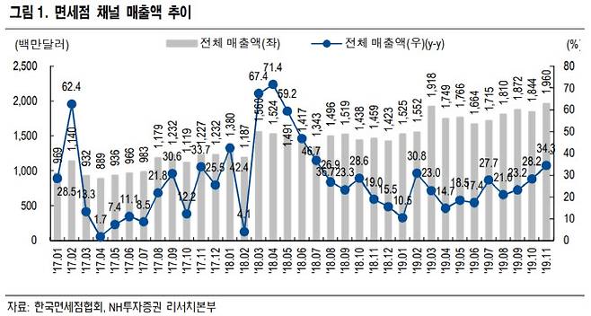 작년 4분기 면세점 채널은 전년동기보다 30% 높은 수준의 매출액 성장률을 보이며 작년 3분기에 이어 호조세가 유지될 전망이다. 10월과 11월 달러 기준 각각 28.2%, 34.3% 매출이 증가했다.