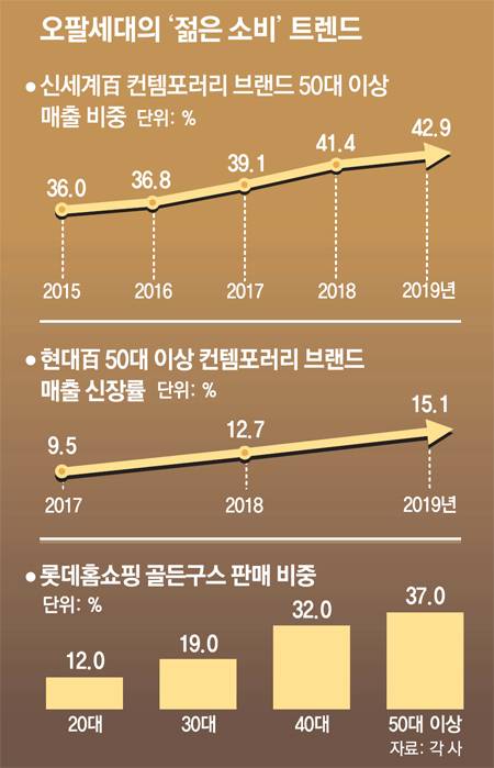 9일 롯데·신세계·현대백화점그룹 등 3대 유통그룹에 따르면 백화점 홈쇼핑 온라인 등의 채널에서 50대 이상의 ‘젊은 소비’ 트렌드가 뚜렷했다. 신세계백화점에선 50대 이상의 컨템포러리 브랜드(최신 트렌드를 이끌고 있는 의류·잡화 등의 상품군) 구매 비중이 지난해 42.9%에 달하며 40대(32.7%)와 30대(20.7%)보다 높았다.