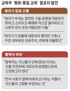 행사는 교육부 주최로 9~10일 서울 마포구에서 교사 대상으로 열린 '평화통일 교육 공감한마당'이다. 매년 개최되는 평화·통일교육 연수로 전국 초·중·고 교사들이 참석한다. 올해는 200여명이 참석했다. 이날 '적대와 혐오를 넘은 평화감수성 회복'이란 제목의 강의를 한 김성경 북한대학원대학교 교수는 보수 성향 단체 시위대를 '태극기부대'로 부르며 탈북자와 더불어 "분단 폭력의 희생자"라고 표현하면서 계몽 대상으로 취급했다. 탈북자는 "한국 사회 적응을 위해 북한을 과잉해서 비판"해야 하는 처지고, 보수 성향 단체는 "사회에서 밀려나 반북·반공주의에 머물러 있는 사람들"이라고 했다.