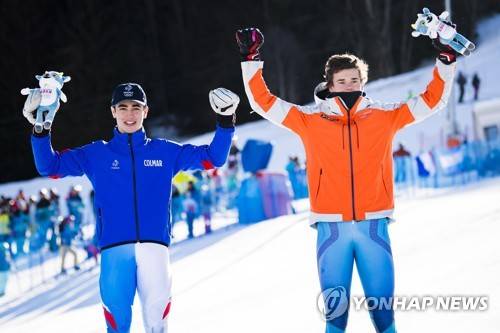 epa08118868 Gold medal ex aequo August Aulnette from France (L) and Gold medal ex aequo Mikkel Remsoey from Norway (R) celebrate on the podium after the men's Alpine Combined race of the alpine skiing event at the Lausanne 2020 Winter Youth Olympic Games, in Les Diablerets, Switzerland, 11 January 2020. EPA/JEAN-CHRISTOPHE BOTT EDITORIAL USE ONLY