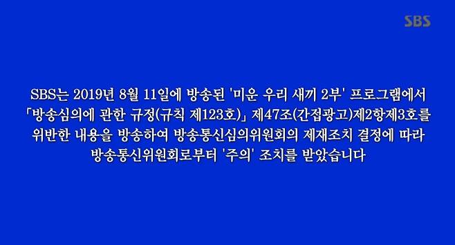 제작진은 자막을 통해 "SBS는 2019년 8월 11일 방송된 '미운 우리 새끼' 2부 프로그램에서 '방송심의에 관한 규정 제 47조(간접광고)제2항제3호를 위반한 내용을 방송해 방송통신심의위원회 제재조치 결정에 따라 방송통신위원회로부터 주의 조치를 받았다"고 전했다.