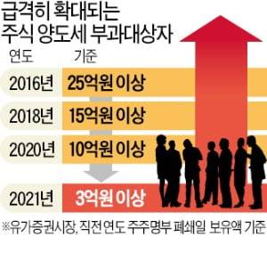 13일 기획재정부에 따르면 오는 4월부터 상장회사 주식을 10억원어치 이상 보유한 투자자는 ‘대주주’로 분류돼 매매차익의 22.0~27.5%(지방세 포함)를 양도소득세로 내야 한다. 대주주 요건을 ‘15억원 이상’에서 ‘10억원 이상’으로 확대했기 때문이다. 내년 4월부터 이 기준이 3억원 이상으로 또다시 대폭 하향 조정된다. 3억원 이하 투자자는 아무리 많은 차익을 거둬도 거래세(매매금액의 0.25%)만 내면 된다는 점에서 대주주 요건 강화는 ‘부자들의 재테크 수단에 대한 증세’란 평가가 나오고 있다.