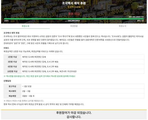조국백서추진위원회에 따르면 조국 백서 발간에 필요한 후원금 3억원 모금이 지난 11일 마감됐다. 홈페이지 개설 나흘 만이다. 마감까지 모두 9329명이 참여했다. 추진위는 “2019년 하반기 이른바 ‘조국 사태’를 거쳐오며 시민들은 검찰과 언론의 민낯을 봤다. 함께 슬퍼하고 분노했던 시민들과 조국 사태를 기록으로 남기기 위해 백서 제작을 준비했다”며 “예상치 못한 뜨거운 참여로 나흘 만에 모금을 마감하게 됐다”고 말했다.