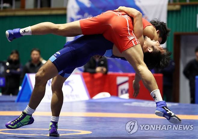 (함평=연합뉴스) 조남수 기자 = 14일 전남 함평문화체육센터에서 열린 2020 도쿄올림픽 레슬링 국가대표 남자 그레코로만형 67kg급 최종선발전에서 삼성생명의 류한수(청색)가 칠곡군청 노영훈에게 공겨을 성공시키며 점수를 획득하고 있다. 2020.1.14