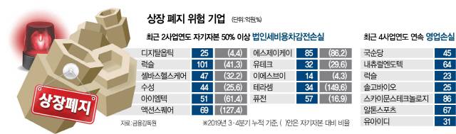 2019년을 포함해 최근 4개 사업연도 중 3개 사업연도의 법인세차감전순손실이 자기자본의 50%를 넘은 종목은 심사 없이 상장폐지가 결정돼 특히 투자에 유의해야 한다는 지적이다.