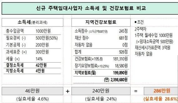 매월 1000만원의 수입이 있는 주택임대사업자가 소득세 46만원 외에 240만원의 건강보험료를 추가로 부담해 실효세율이 28.6%에 달한다는 통계도 나왔다.