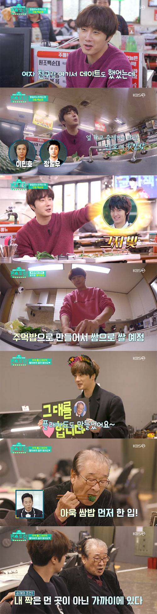 '먹일우'라는 별명답게 폭풍 순대 먹방을 펼치던 정일우는 "여자친구랑도 왔었는데"라며 고교시절의 추억을 떠올리며 배우가 된 지금까지 절친하게 지내는 친구 이민호와의 만남에 대해 털어놨다. 두 사람은 현재까지도 서로의 촬영장에 커피차를 보내주는 등 끈끈한 우정을 이어가고 있다.